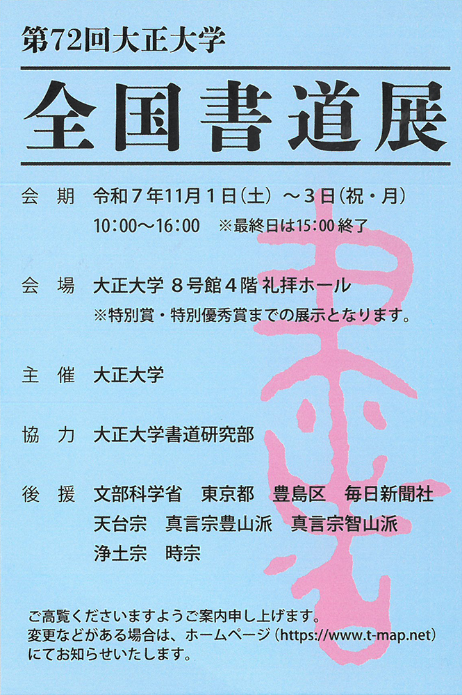 ■入場無料 ■主催:大正大学 ■協力:大正大学書道研究部 ■後援:文部科学省、東京都、豊島区、毎日新聞社、 天台宗、真言宗豊山派、真言宗智山派、浄土宗、時宗